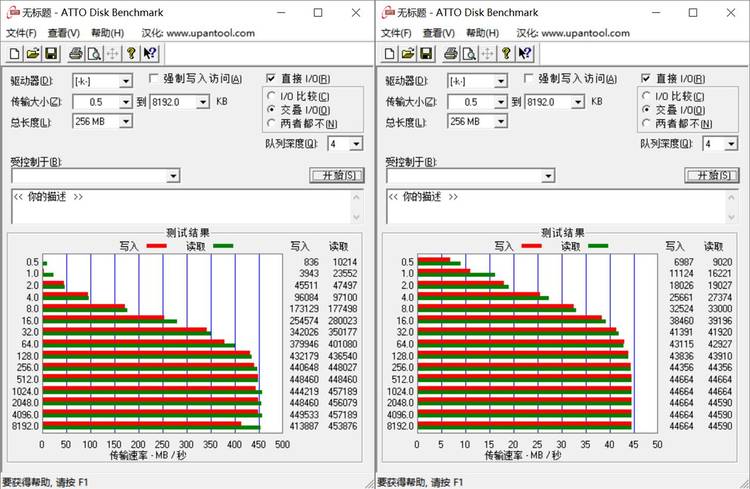 简单使用移动硬盘盒+固态硬盘分别测试接上集线器与电脑自带的USB3.0接口的速度,左是集线器读写的测试:读取453、写入413,右侧是电脑直插读写的测试:读取445、写入446,对比数据两者相差不大。