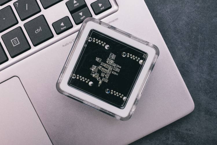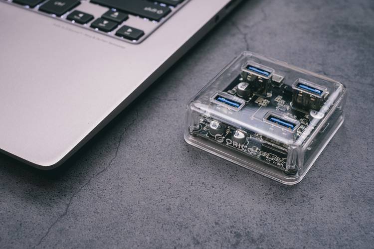 这个透明的USB3.0 HUB集线器,外观是方形的,非常的小巧,透过透明的外壳,可以看见内部同样采用了黑色PCB电路板设计。