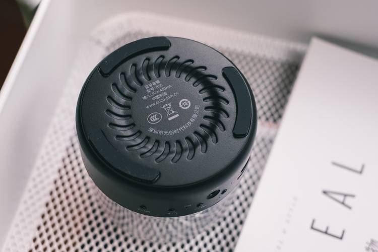 在音箱的底部上呈三角分布了硅胶防滑垫,可以减少纯平面与摆放桌面的接触发声共振移位问题,在音箱的中间是它的性能参数铭牌贴。音箱内置了400mAh电池,可以携带到户外使用,非常的方便。