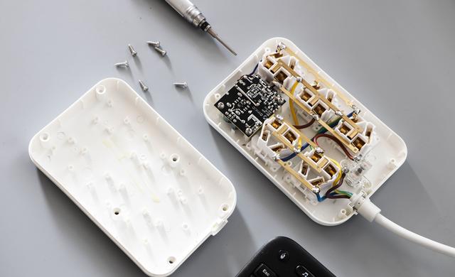 从拆解图上可以看出,5插位上均使用了一体冲压成型的铜材,好处就是有更好的导电性。不过,介于内部空间布局的考虑,在2插位与3插位之间桥接所使用的是纯铜电线来连接,并没有整体采用一体成型的铜条,好在铜线较为粗实,焊点也比较圆润。