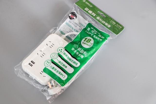 收到货后,外包装是这样哒!是不是感觉很熟悉?五金店里墙上挂着很多的那品牌,对!就是公牛拖线板。这包装风格是不是很有公牛的味道?同样是采用透明绿搭配的厚实塑料包装袋,上面印有功能特点及详细的铭牌信息。