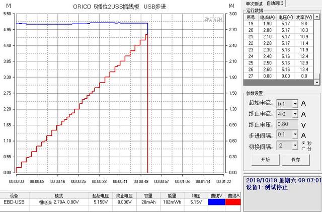 步进测试主要是查看其USB接口输出的真实带载能力,从测试结果来看,这款排插USB输出口单口输出最高可达2.6A,并且电压还保持在5V之上,功率可达13.4W,由此可见单口输出性能还是非常不错的。另外曲线图上也可以看出,USB输出后半程随着电流的增大,电压也在增加,说明具备线功能。